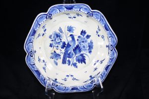 D03013 – Royal Delft blue and white hexagonal dish with décor of exotic bird and flowers.