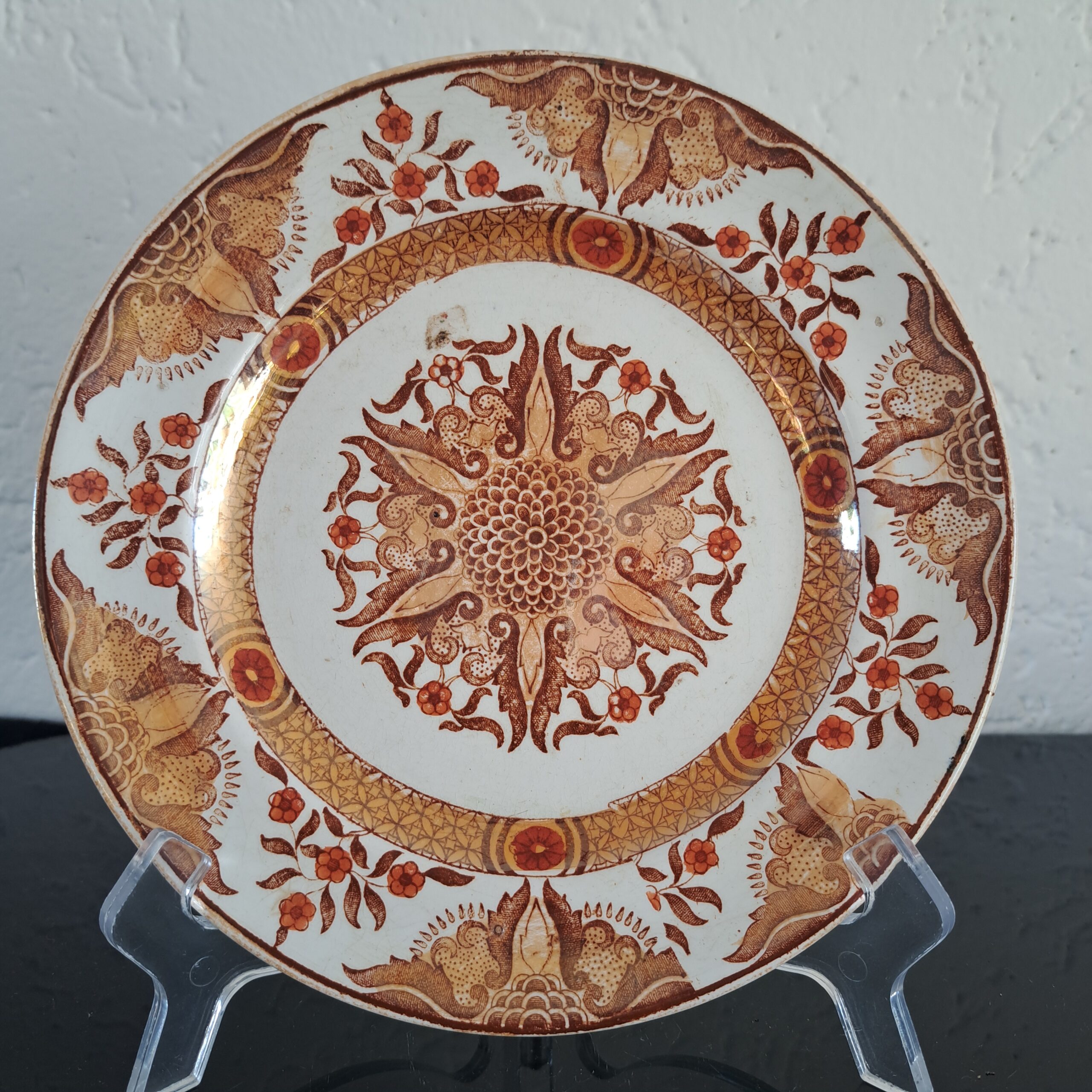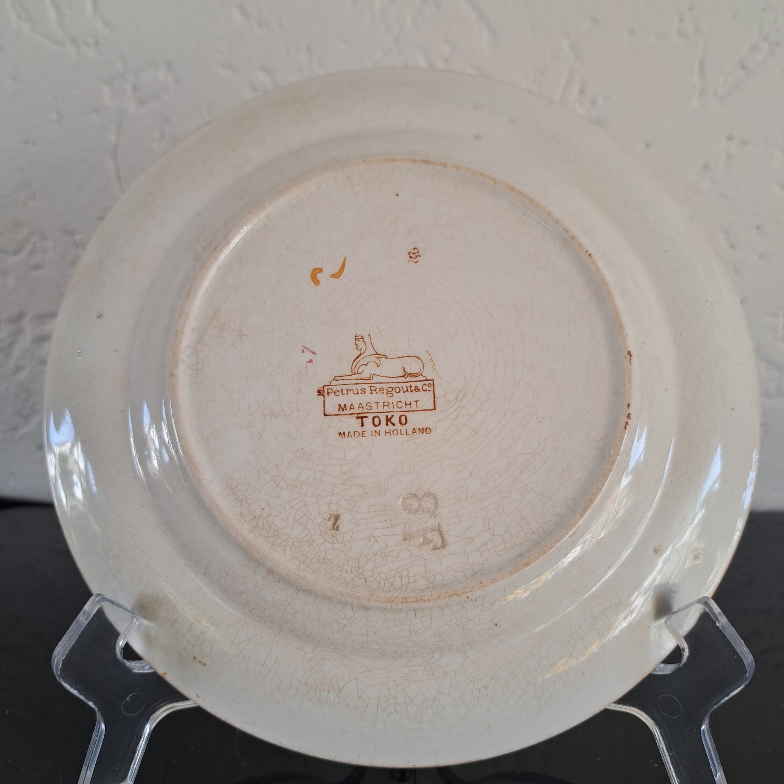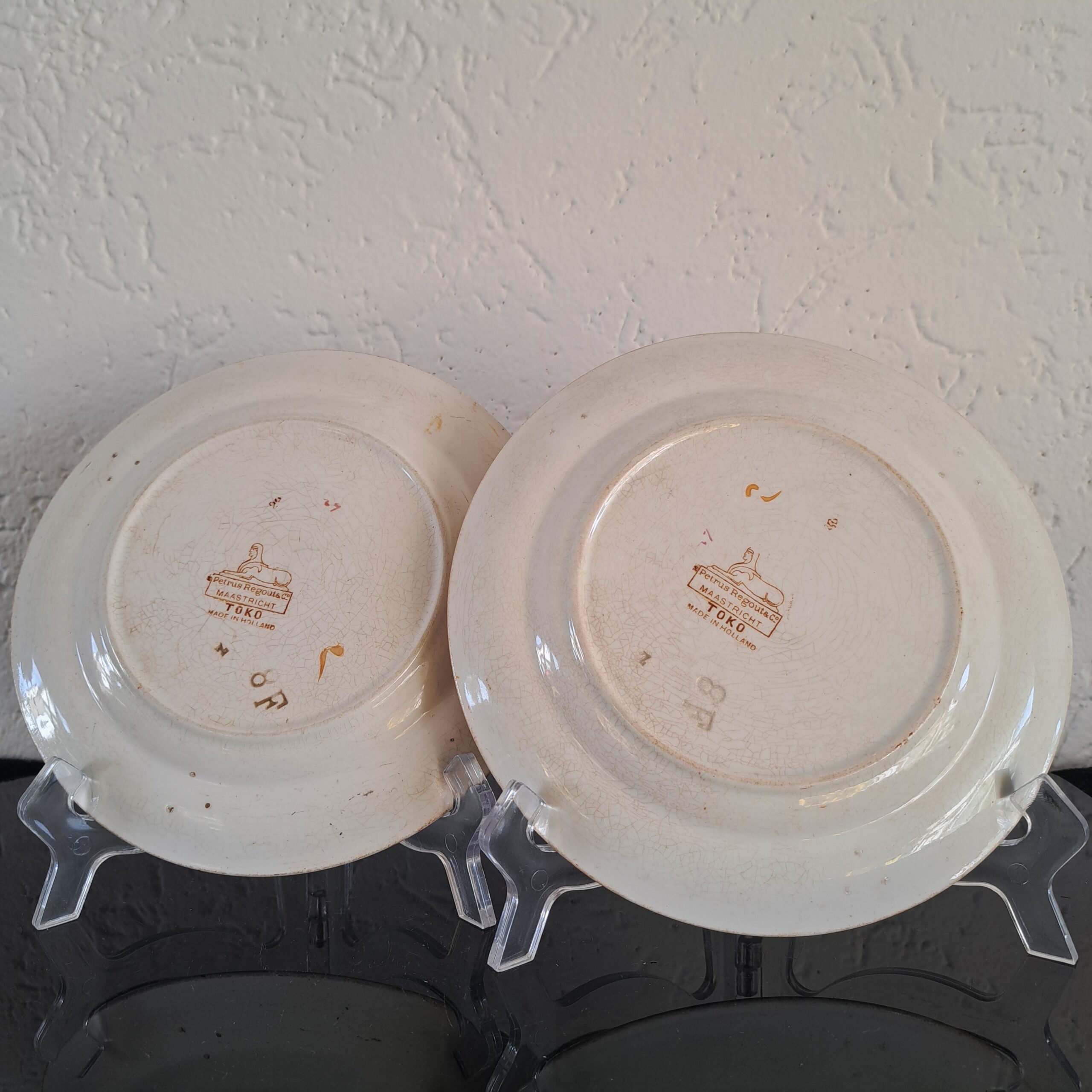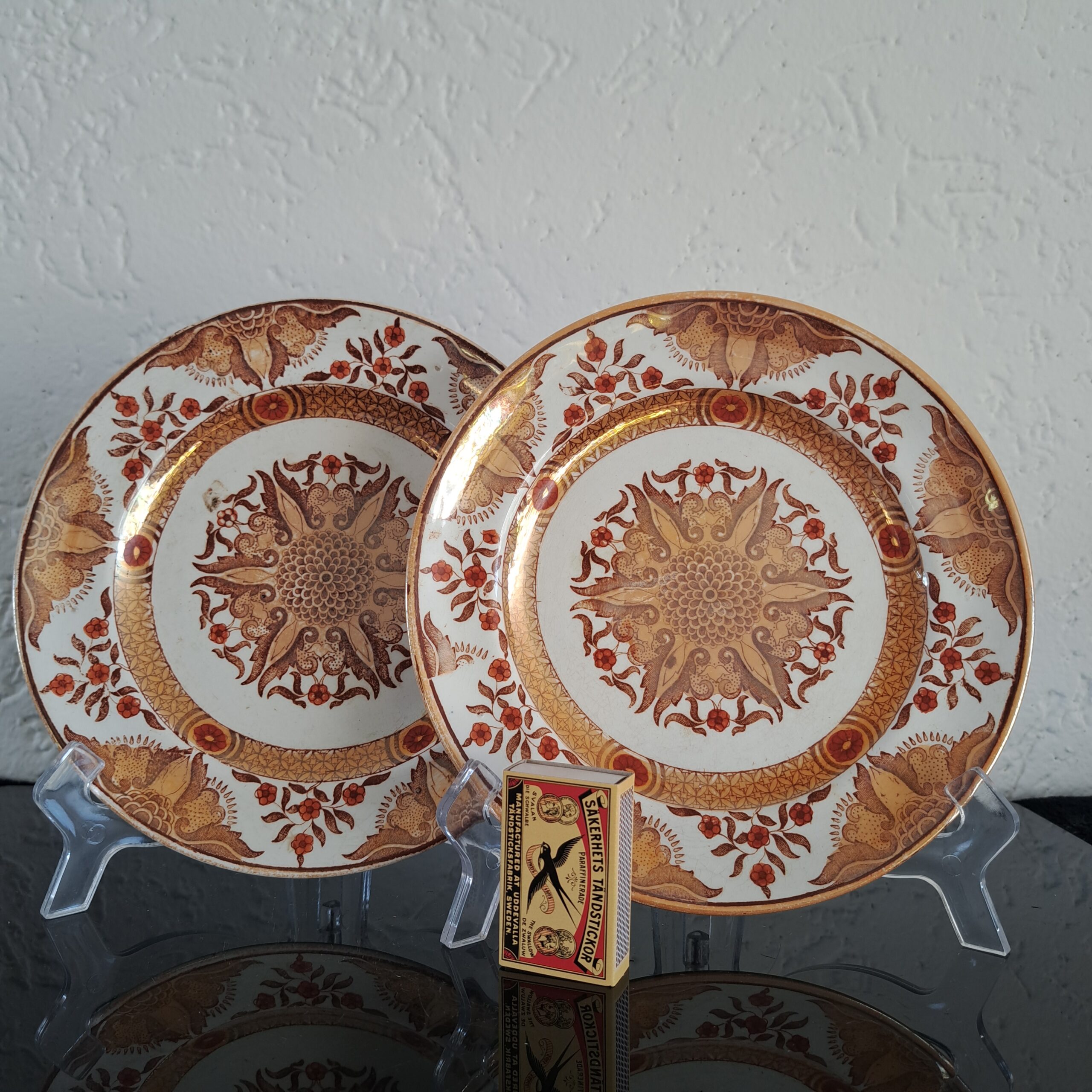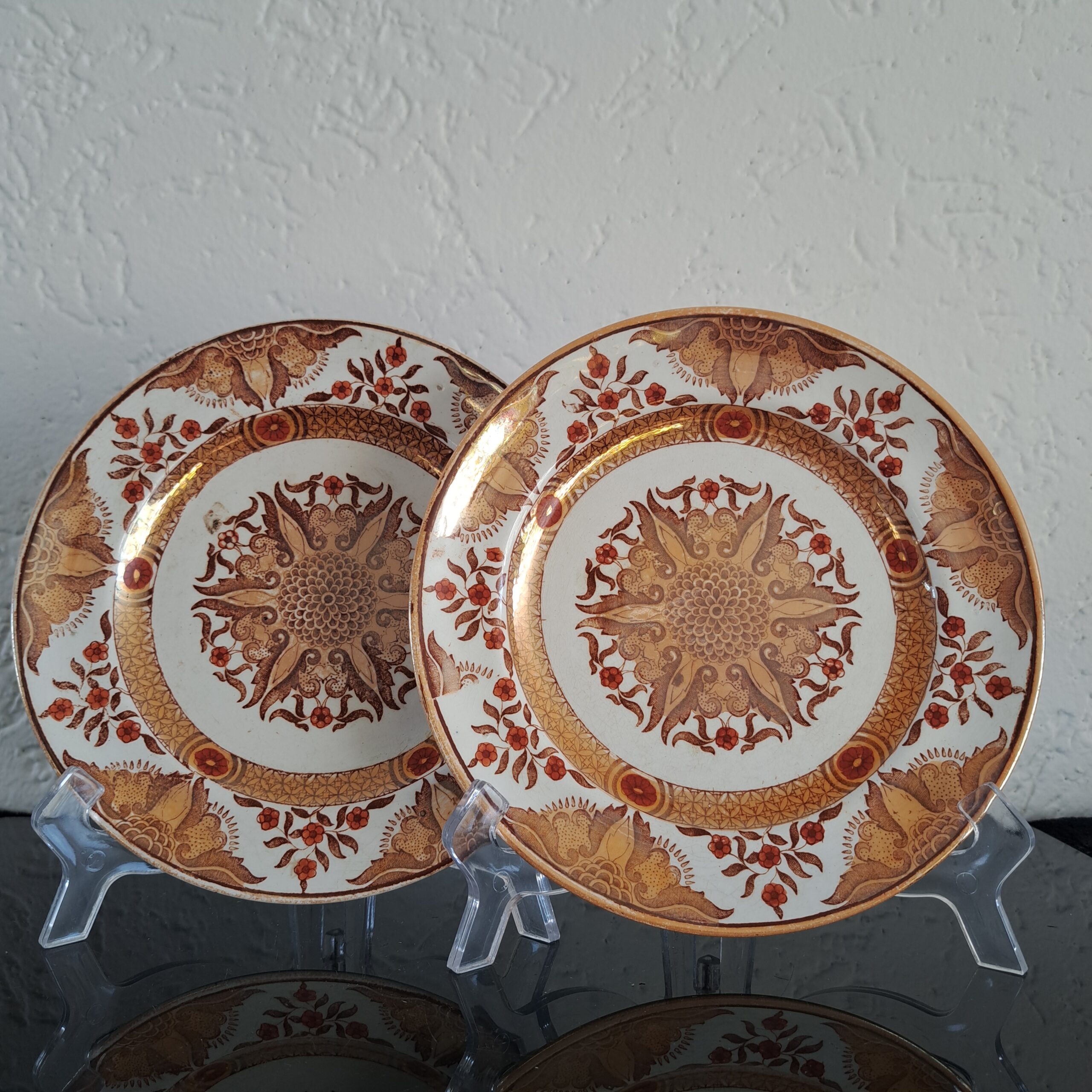 Set of two Petrus Regout Maastricht décor Toko lusterware plates. Brown on white, transferware. Made in Holland.