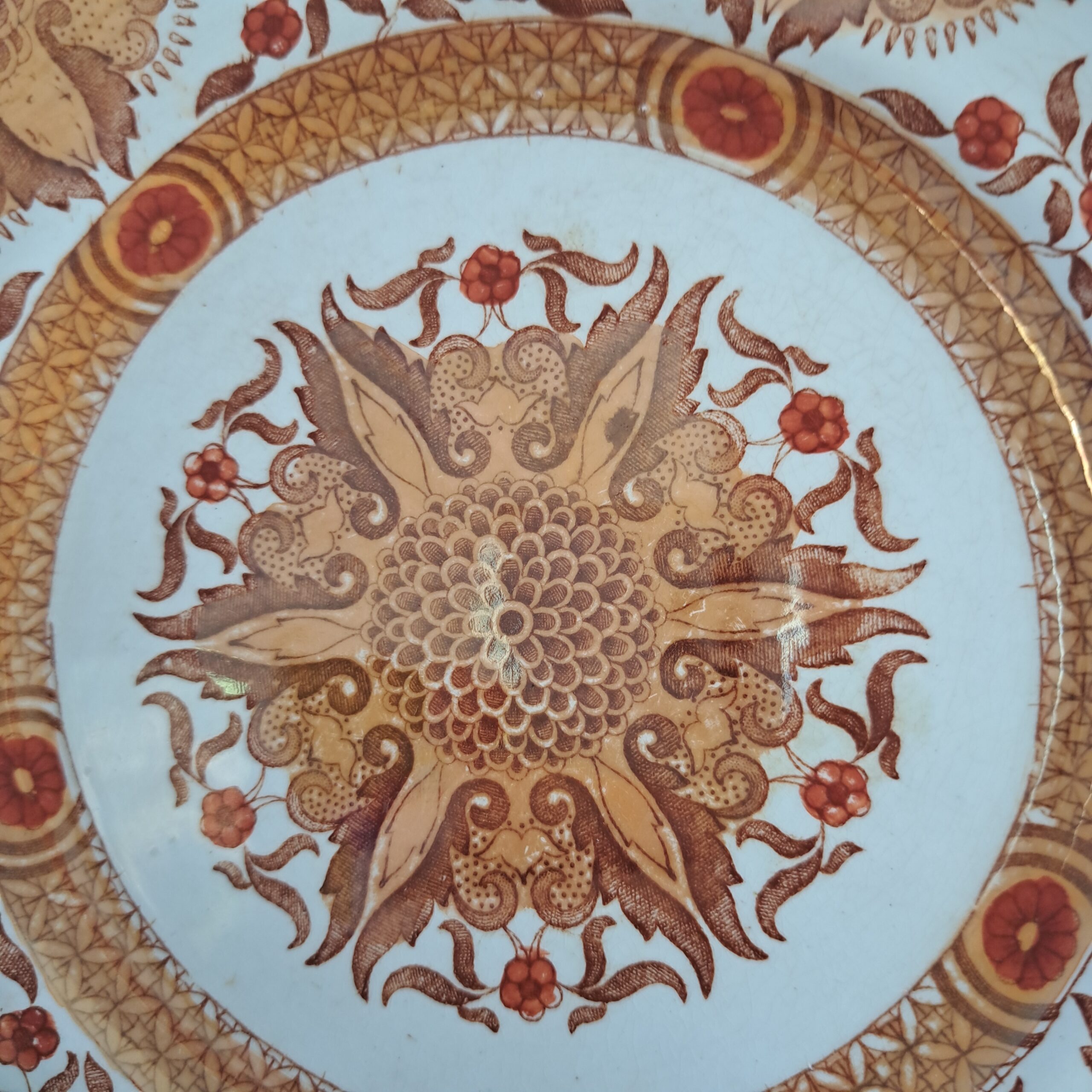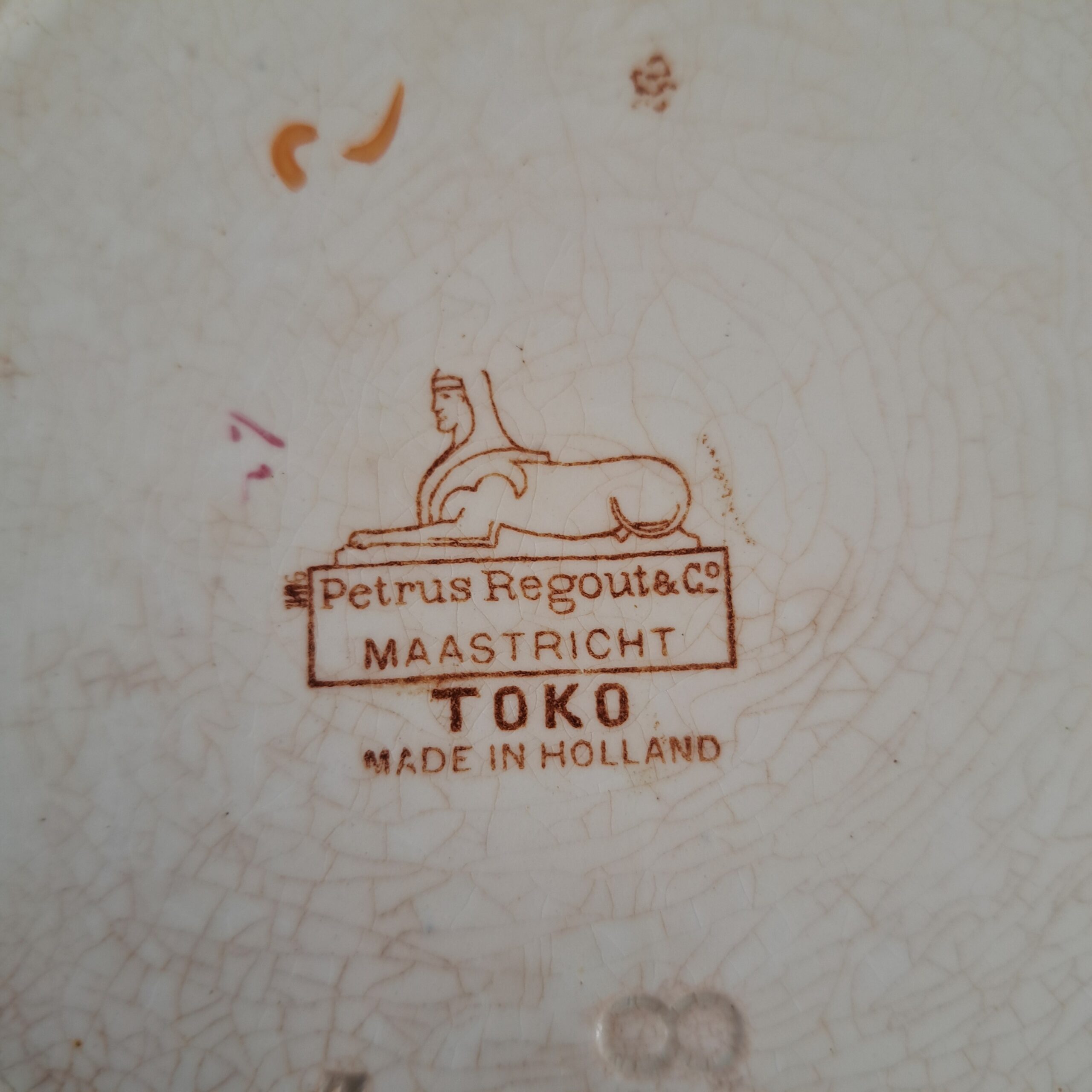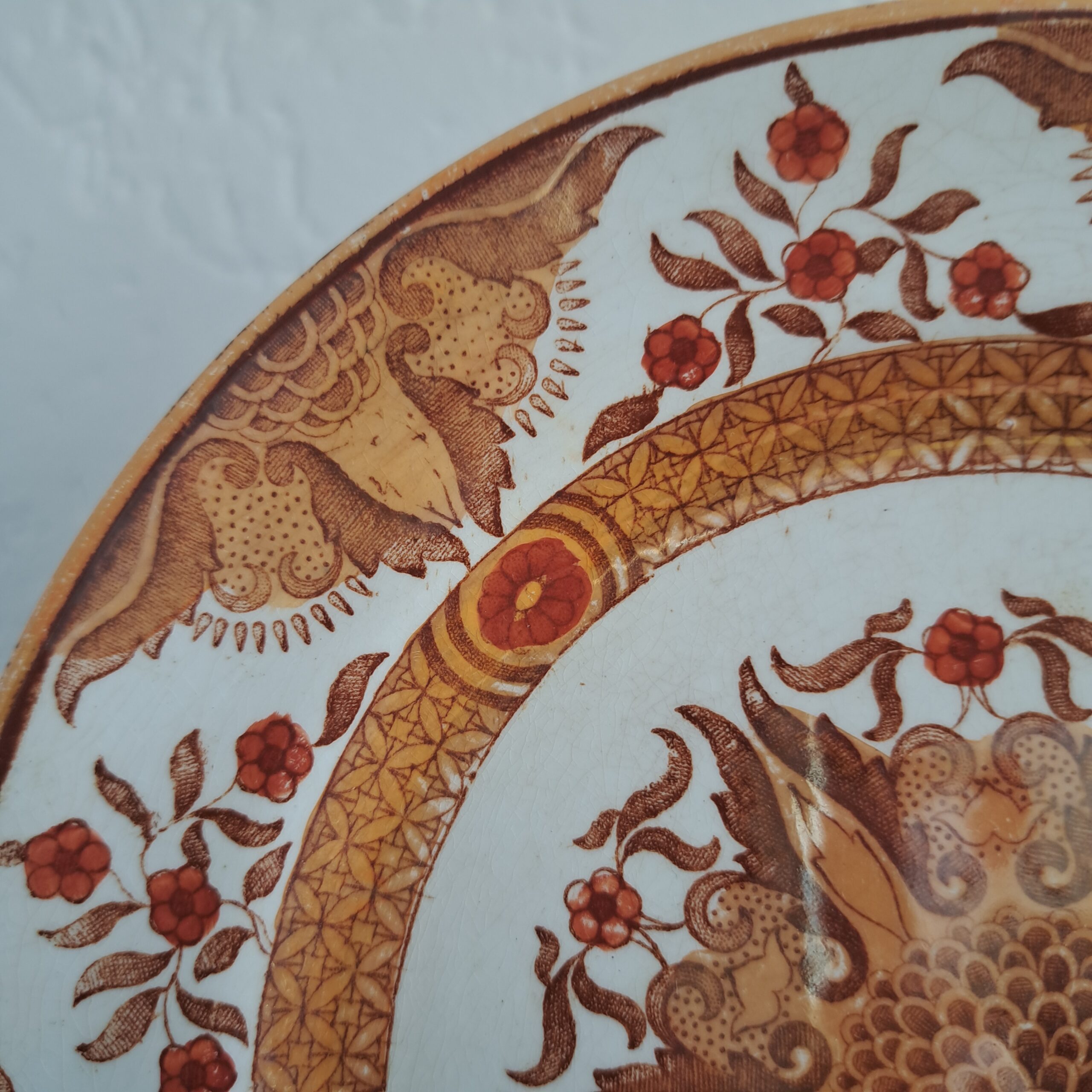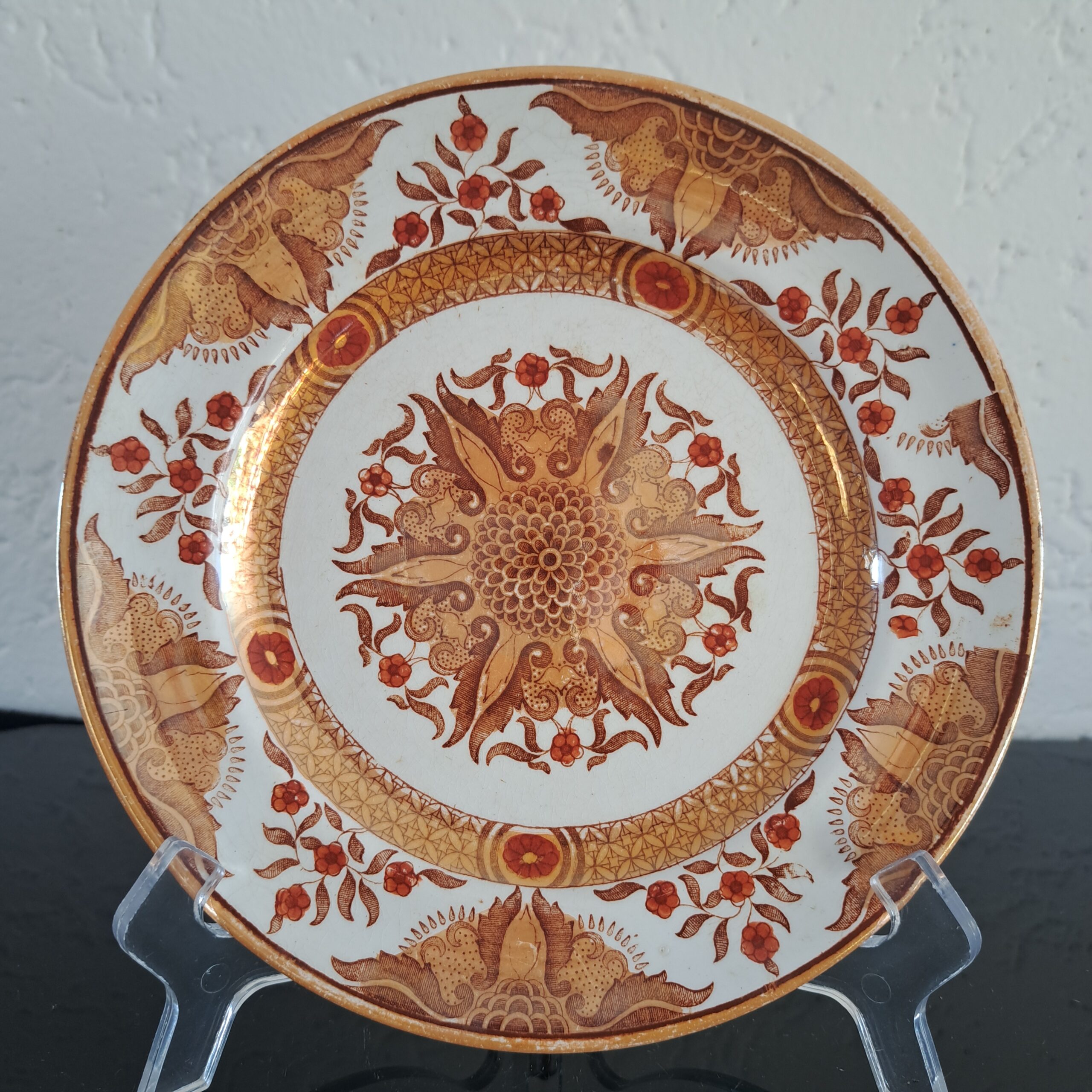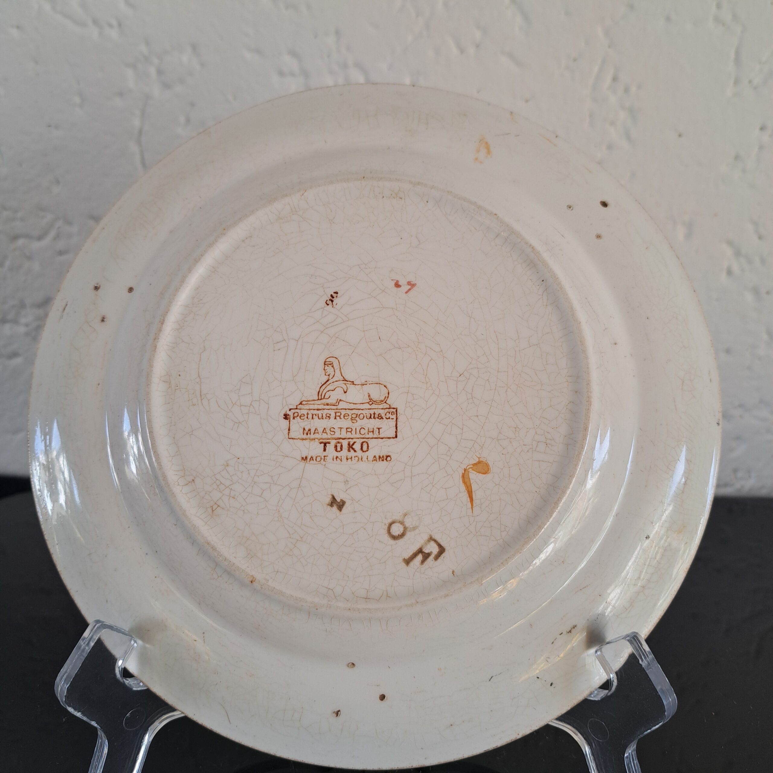 Set of two Petrus Regout Maastricht décor Toko lusterware plates. Brown on white, transferware. Made in Holland.